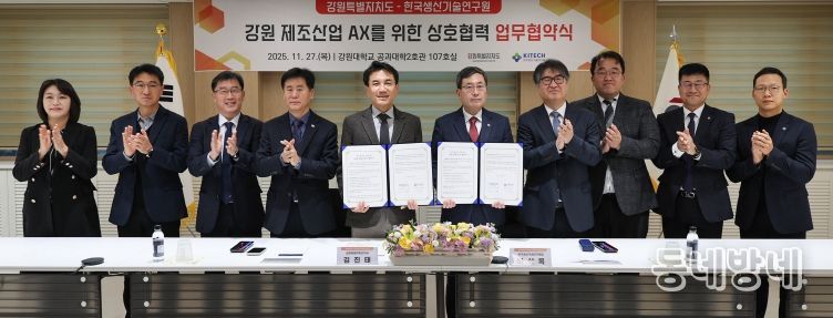 동네방네 김형규 기자 | 강원특별자치도는 11월 27일 오후 3시, 강원 제조산업의 AX(AI Transformation, 인공지능 전환)를 위한 상호 협력을 강화하기 위해 한국생산기술연구원(원장 이상목)과 업무협약(MOU)을 체결했다.