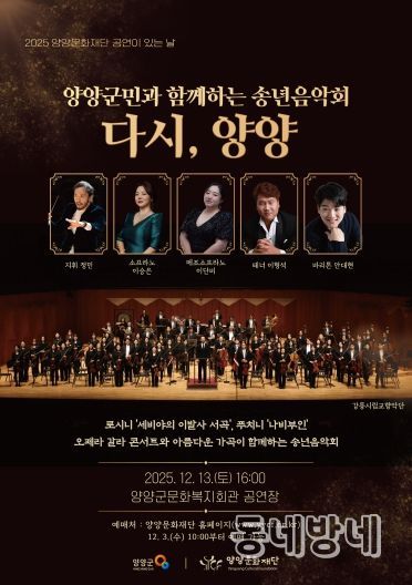 동네방네 김형규 기자 | (재)양양문화재단은 오는 12월 13일 오후 4시, 양양군문화복지회관 공연장에서 정민 상임지휘자가 이끄는 강릉시립교향악단과 소프라노 이승은, 메조소프라노 이단비, 테너 이형석, 바리톤 안대현이 함께하는 '2025 양양군민과 함께하는 송년음악회 – 다시, 양양'을 개최한다.