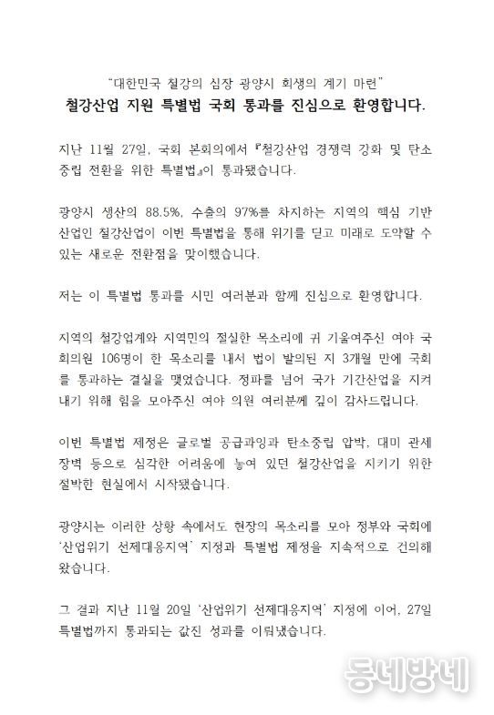 동네방네 김형규 기자 | 광양시는 지난 11월 27일 국회 본회의에서 '철강산업 경쟁력 강화 및 저탄소 전환 촉진을 위한 특별법(이하 ‘K-스틸법’)'이 통과된 데 대해 환영의 뜻을 밝혔다.