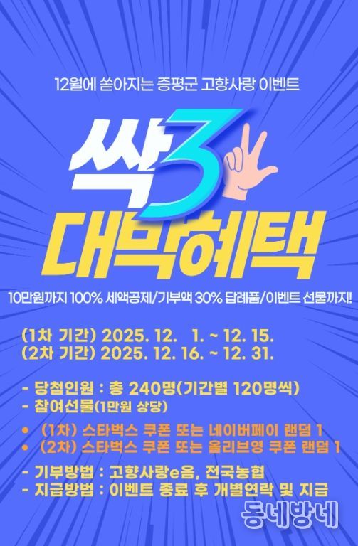 군 관계자는 “2025년 한 해를 마무리하며 아직 혜택을 누리지 못한 분들을 위해 이번 이벤트를 준비했다”며, “증평군 발전을 위해 기부해 주시고 연말정산 세제 혜택은 물론 답례품과 이벤트 혜택까지 누리실 수 있도록 많은 관심과 참여 부탁드린다”고 전했다.
