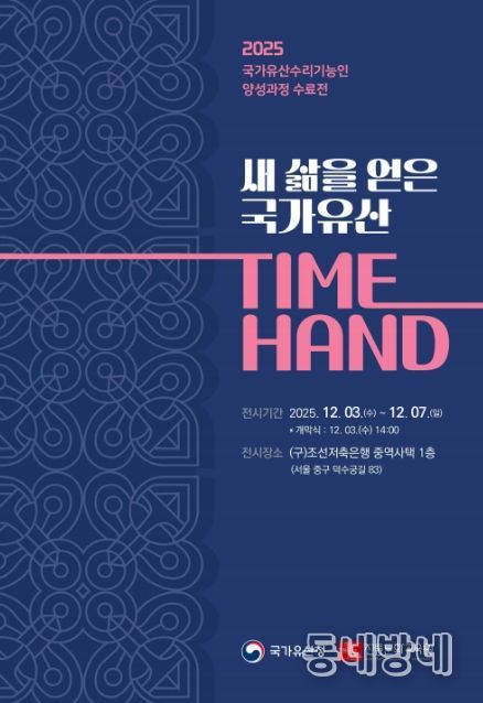 동네방네 김형규 기자 | 국가유산청 한국전통문화대학교 전통문화교육원은 12월 3일부터 12월 7일까지 덕수궁 선원전 영역 내 구(舊) 조선저축은행 중역사택(서울 중구)에서 ‘국가유산 수리기능인 양성과정’ 교육생들의 성과품을 모아 선보이는 '국가유산 수리기능인 양성과정 수료전, ‘새 삶을 얻은 국가유산 TIME HAND’'를 개최한다.