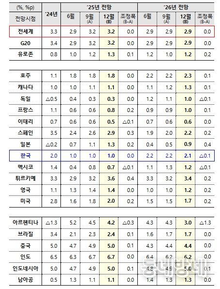 향후 세계경제 성장률은 ’25년 3.2%, ’26년 2.9%, ’27년 3.1% 수준으로 전망된다. 지역별로 살펴보면, 미국은 고용 부진과 관세 인상에 따른 물가 전가 등의 영향으로 ’26년 성장세가 둔화(’25년2.0→’26년1.7→’27년1.9%)될 전망이다. 일본은 금년 내수를 바탕으로 견조한 성장을 기록하겠으나 순수출이 하방요인으로 작용하며 성장세가 둔화(’25년1.3→’26년0.9→’27년0.9%)될 것으로 예상된다. 유로 지역은 ’26년 소폭 둔화된 이후 내수 회복과 무역 반등에 힘입어 ’27년 회복(’25년1.3→’26년1.2→’27년1.4%)할 전망이다. 중국의 경우 부동산 부문의 지속 부진과 조기선적 효과 소멸 등의 영향으로 성장세가 둔화(’25년5.0→’26년4.4→’27년4.3%)될 전망이다.