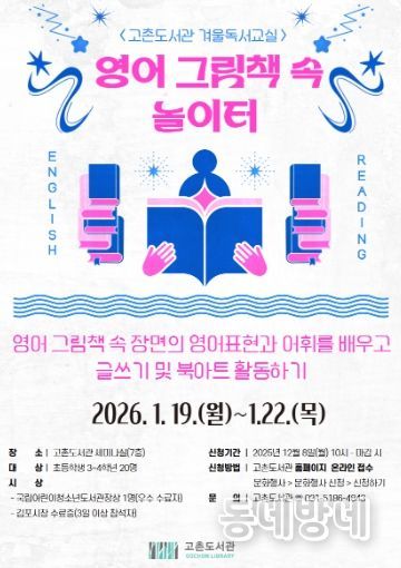 동네방네 김형규 기자 | 김포시 고촌도서관은 오는 2026년 1월 19일부터 1월 22일까지 초등학생 3~4학년을 대상으로 겨울독서교실 '영어 그림책 속 놀이터'를 운영한다.