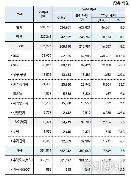 동네방네 김형규 기자 | 국토교통부는 12월 2일 국회 본회의 의결을 거쳐 ‘26년 국토부 예산이 62.8조원으로 최종 확정됐다고 밝혔다.