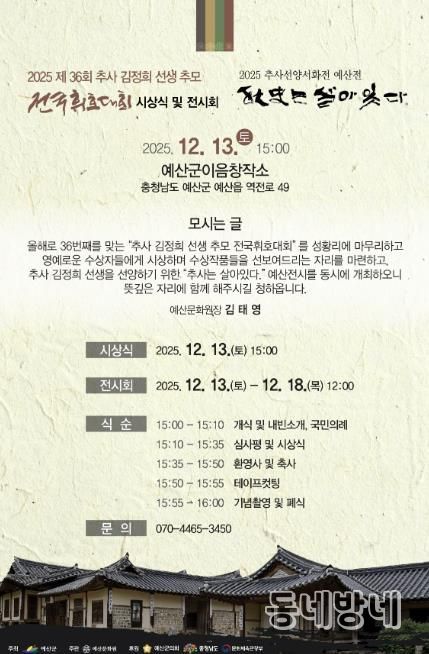 동네방네 김형규 기자 | 예산문화원은 지난 10월 11일 개최된 ‘제36회 추사김정희선생 추모 전국휘호대회’ 시상식을 오는 12월 13일 예산군 이음창작소에서 진행한다고 밝혔다.