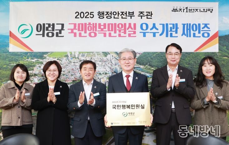 동네방네 김형규 기자 | 의령군이 행정안전부가 주관하는 ‘국민행복민원실’ 재인증 평가에서 우수기관으로 선정됐다. 인증 기간은 2025년 12월 1일부터 2028년 12월 31일까지 3년간이다.