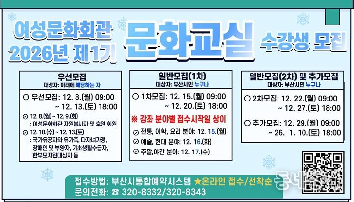 동네방네 김형규 기자 | 부산시 여성문화회관은 오는 내일(8일)부터 '2026년 제1기 문화교실' 수강생을 모집한다고 밝혔다.