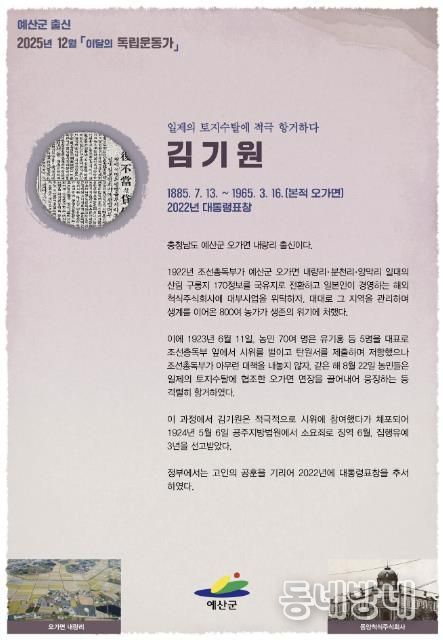 동네방네 김형규 기자 | 예산군은 오가면 내량리 출신 김기원 선생을 2025년 12월 ‘이달의 독립운동가’로 선정했다고 밝혔다.