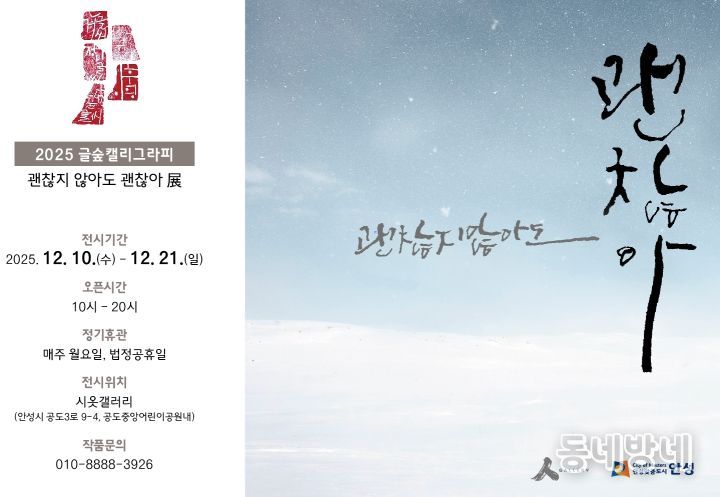 동네방네 김형규 기자 | 공도 작은미술관 시옷갤러리는 오는 12월 10일부터 12월 21일까지 글숲 캘리그라피 작가들이 참여하는 전시 ‘괜찮지 않아도 괜찮아’ 전을 개최한다.