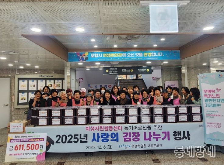 동네방네 김형규 기자 | 포항시 평생학습원 여성문화관 여성자원활동센터는 8일 독거어르신 50명을 대상으로 ‘2025년 사랑의 김장나누기 행사’와 반찬지원 기부금 전달식을 진행했다.