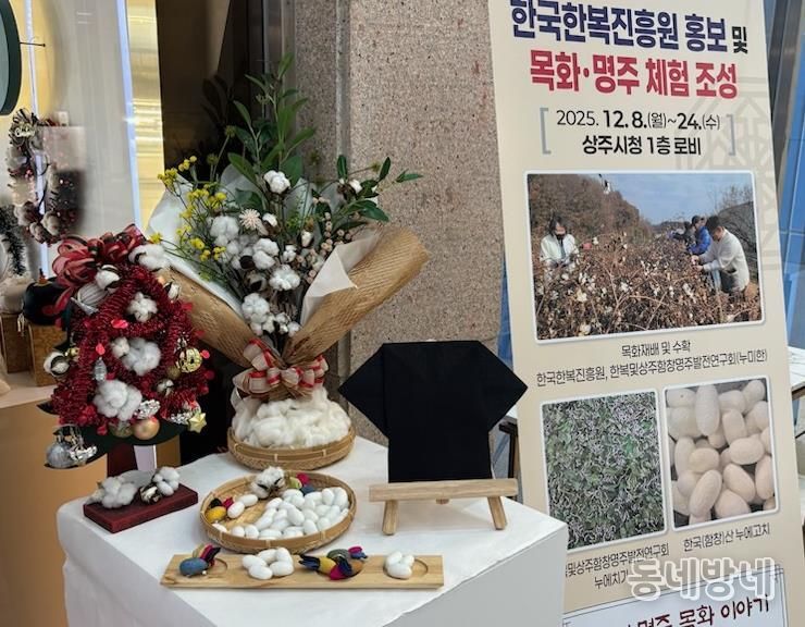 동네방네 김형규 기자 | 한국한복진흥원 입주기업 누미한은 12월 8일부터 12월 24일까지 진흥원 내 목화밭에서 재배한 목화솜과 명주천을 활용한 체험형 전시를 상주시청 로비에서 진행한다.