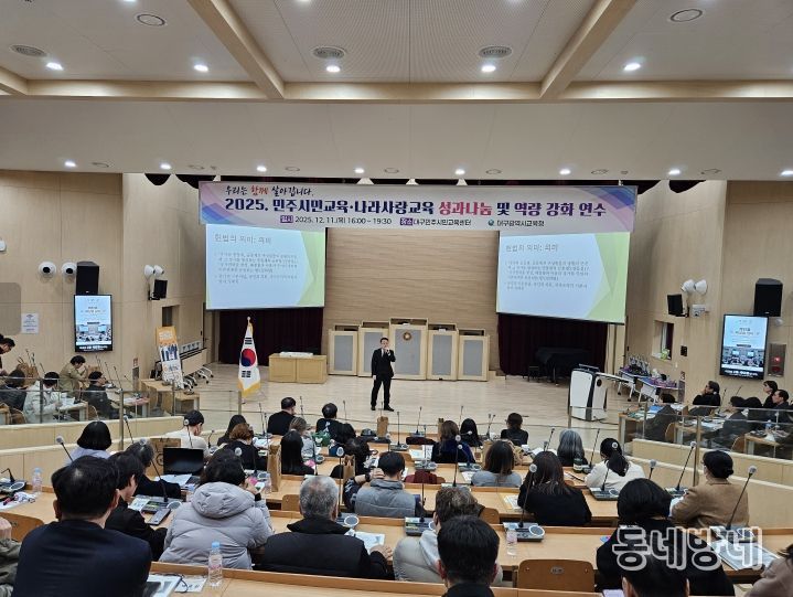동네방네 김형규 기자 | 대구시교육청은 12월 11일 오후 4시 20분부터 대구민주시민교육센터 세담홀에서 초·중·고 교원 및 학교 관리자 등 130여 명을 대상으로 ‘민주시민교육·나라사랑교육 성과 나눔 및 역량 강화 연수’를 개최했다.