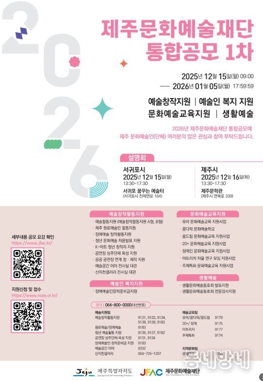 동네방네 김형규 기자 | 제주문화예술재단(이사장 김석윤)은 2026년도 지원사업 1차 통합공모를 실시한다. 접수 기간은 2025년 12월 15일부터 2026년 1월 5일까지이며, 문화예술교육 지원사업은 2026년 1월 9일까지 접수한다.