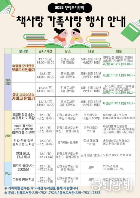 동네방네 김형규 기자 | 창원특례시 진해도서관과는 연말을 맞아 가족과 함께 즐길 수 있는 따뜻하고 풍성한 ‘2025 책사랑 가족사랑 행사’를 진해도서관 및 동부도서관에서 12월 한 달간 운영한다.
