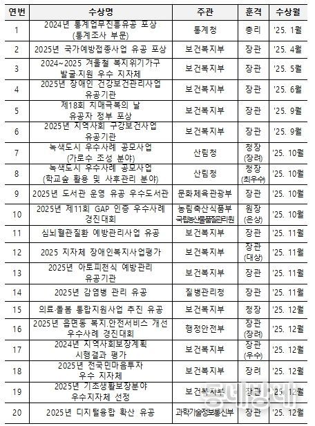수상 내역을 살펴보면 분야별 ▲ 보건․의료 9건, ▲ 사회복지 5건, ▲ 일반행정 3건, ▲ 환경 2건, ▲ 농업 1건으로, 주민의 삶의 질과 직결되는 보건 복지 분야에서 특히 두드러진 성과를 보였다.