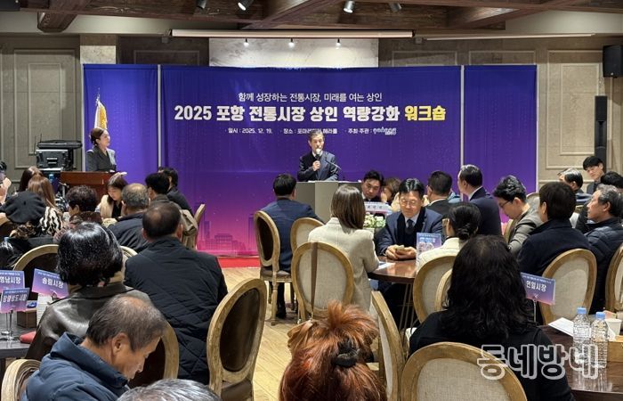 동네방네 김형규 기자 | 포항시는 지난 19일 포마레웨딩컨벤션에서 서재원 포항시 정무특보, 임주희 포항시의회 경제산업위원장을 비롯해 지역 전통시장 상인회 임원 등 관계자 100여 명이 참석한 가운데 2025년 ‘포항시 전통시장 상인 역량강화 워크숍’을 개최했다.