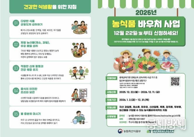 동네방네 김형규 기자 | 서울 서초구는 취약계층의 식품 접근성을 높이고 안정적인 식생활을 지원하기 위해 12월 22일부터 ‘2026년 농식품바우처 사업’ 신청자를 모집한다고 밝혔다.