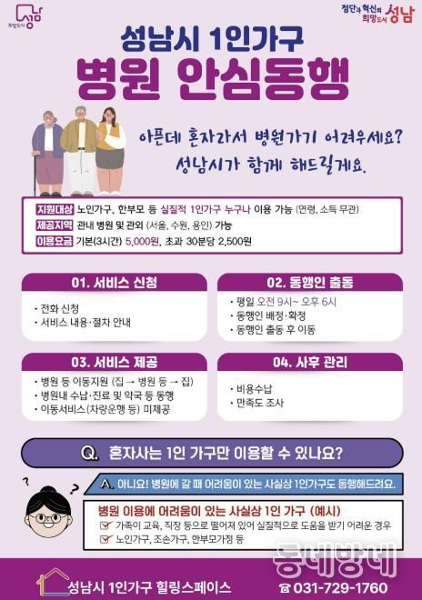 동네방네 김형규 기자 | 성남시는 ‘1인 가구 병원 안심 동행 서비스’ 추진을 위해 전문 인력을 기존 4명에서 5명으로 늘렸다고 22일 밝혔다.