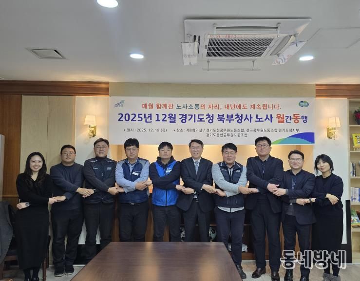동네방네 김형규 기자 | 경기도 북부청과 경기도청 3개 노동조합(경기도청공무원노동조합, 전국공무원노동조합 경기도청지부, 경기도통합공무원노동조합)은 ‘노사월동(노사 월간동행)’을 매월 정기적으로 운영해 오며 실질적인 조직문화 개선과 노사 간 신뢰 회복 기틀을 마련했다고 22일 밝혔다.