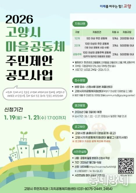 동네방네 김형규 기자 | 고양특례시는 이웃과 함께 마을 활동에 참여하며 주민 스스로 지역 문제를 해결해 나가는 ‘2026년 고양시 마을공동체 주민제안 공모사업’에 참여할 공동체를 내년 1월 19일부터 모집한다고 밝혔다.