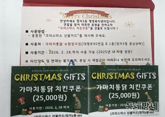 동네방네 김형규 기자 | 수원시 장안구 정자3동은 지난 18일 관내 저소득 한부모가족 33세대에 치킨쿠폰을 전달하며 연말 온정을 전했다.