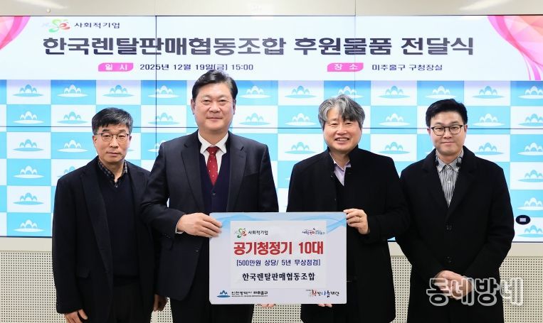 동네방네 김형규 기자 | 인천 미추홀구는 지난 19일 사회적기업 한국렌탈판매협동조합(대표 정영이)으로부터 공기청정기 10대를 전달받았다.