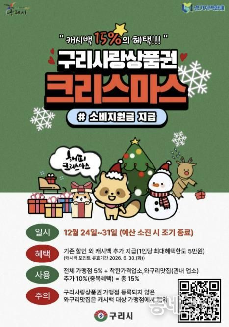 동네방네 김형규 기자 | 구리시는 12월 24일부터 ‘구리사랑상품권 크리스마스 소비 지원금’을 지급한다고 밝혔다. 이번 소비 지원금은 연말연시 기간 지역 외로 유출되는 소비를 지역 내로 유도하고, 관내 상권 활성화와 소상공인 보호를 위해 마련됐으며, 예산 소진 시 조기 종료될 수 있다.