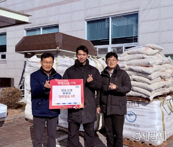 동네방네 김형규 기자 | 양평군 양동면은 지난 19일 양동건재 류용상 씨가 양동면사무소를 방문해 겨울철 제설작업에 사용될 염화칼슘 5톤을 기탁하며 지역사회 안전과 이웃사랑 실천에 동참했다고 밝혔다.