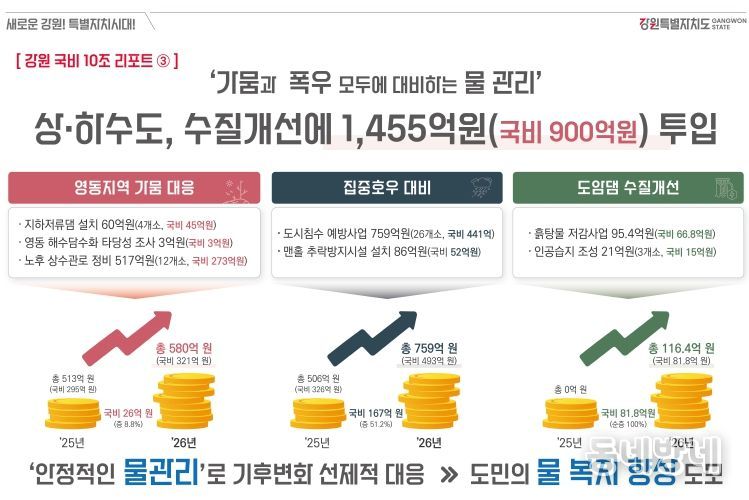 동네방네 김형규 기자 | 강원특별자치도는 내년도에 1,455억 원을 투입하여 가뭄 및 집중호우 등 물로 인한 기후변화와 자연재해로부터 안전한 강원자치도를 만들어 나갈 계획을 밝혔다.