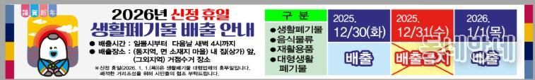 동네방네 김형규 기자 | 거제시는 내년 1월 1일, 신정 휴일에는 생활폐기물 수거 대행업체의 휴무가 시행됨에 따라 일반생활·음식·재활용, 대형 생활폐기물이 수거되지 않는다고 밝혔다.
