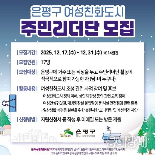 동네방네 김형규 기자 | 서울 은평구는 여성친화도시 조성을 위해 함께 할 ‘여성친화도시 주민리더단’ 단원을 새로 모집한다고 밝혔다.