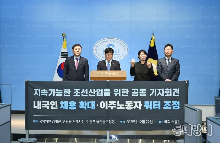 동네방네 김형규 기자 | 변광용 거제시장은 지난 22일 김태선 국회의원(울산동구, 환경노동위), 김종훈 울산 동구청장과 함께 국회 소통관에서 기자회견을 열고, ‘조선산업기본법’ 제정, 내국인 채용 확대, 외국인 쿼터 축소를 골자로 한 고용구조 전환의 필요성을 정부에 촉구했다.
