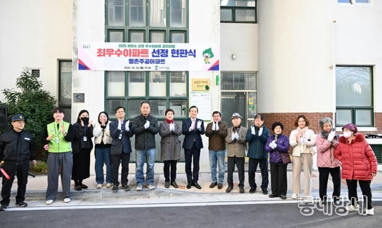 동네방네 김형규 기자 | 울산 북구는 22일 2025년 저탄소 실천 우수아파트 경진대회에서 최우수아파트로 선정된 명촌주공아파트에서 현판식을 열었다.