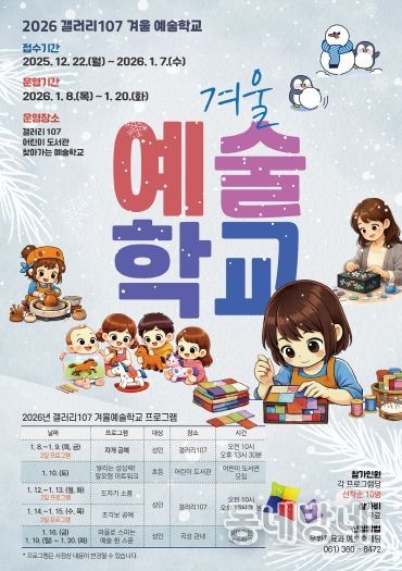 동네방네 김형규 기자 | 전라남도 곡성군이 운영하는 갤러리 107에서 오는 12월 22일부터 내년 1월 7일까지 ‘겨울 예술학교’ 프로그램 참가자를 모집한다고 밝혔다.