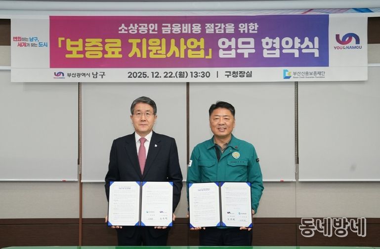 동네방네 김형규 기자 | 부산 남구는 부산신용보증재단(이사장 성동화)과 지난 12월 22일 남구청에서 소상공인 경영 안정과 민생경제 활성화를 위한 '남구 소상공인 보증료 지원사업 업무협약'을 체결했다고 밝혔다.