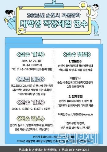 동네방네 김형규 기자 | 순천시는 겨울방학을 맞아 대학생들에게 행정 현장 경험의 기회를 제공하기 위해 ‘2026년 겨울방학 대학생 직장체험 연수생’을 모집한다고 밝혔다.
