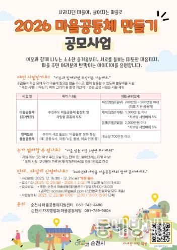 동네방네 김형규 기자 | 순천시는 주민이 주도하는 마을공동체 활동을 활성화하고, 이웃돌봄을 기반으로 한 지역 안전망을 강화하기 위해 2026년 '마을공동체 만들기 공모사업' 참여 공동체를 모집한다.