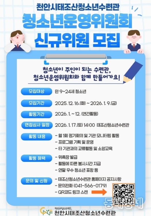 동네방네 김형규 기자 | (재)천안시청소년재단 천안시태조산청소년수련관은 내년 1월 9일까지 2026년 청소년운영위원회 신규 위원을 모집한다고 24일 밝혔다.
