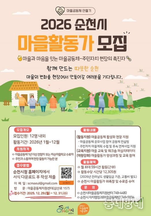 동네방네 김형규 기자 | 순천시는 마을공동체 만들기 공모사업의 원활한 추진과 주민자치·마을공동체 활성화 등 따뜻한 순천을 함께 만들어갈 2026년 마을활동가 12명을 모집한다고 밝혔다.