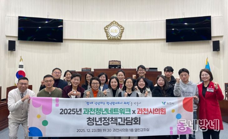 동네방네 김형규 기자 | 과천시는 지난 23일 과천시의회 열린강좌실에서 과천청년네트워크와 과천시의회 의원이 참석한 가운데 ‘함께 성장하는 청년참여도시 과천을 만들다, 2025년 과천시 청년정책 발전을 위한 청년정책간담회’를 개최했다고 밝혔다.