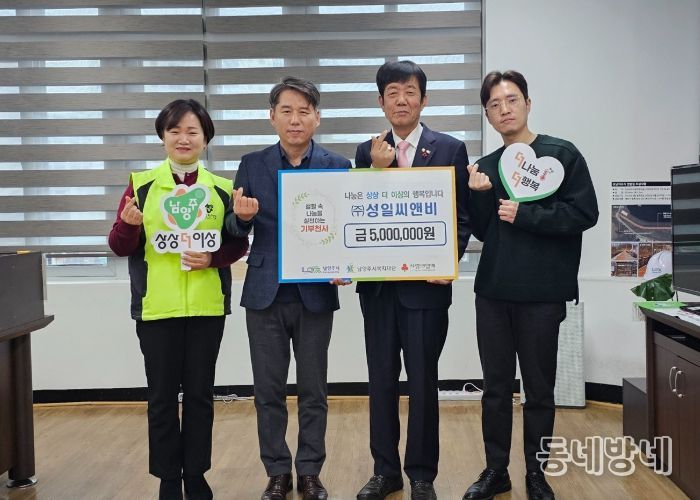 동네방네 김형규 기자 | 남양주시는 지난 23일 오남읍사무소에서 ㈜성일씨앤비가 연말을 맞아 오남읍 취약계층 지원을 위해 후원금 500만 원을 남양주시복지재단에 기부했다고 밝혔다.