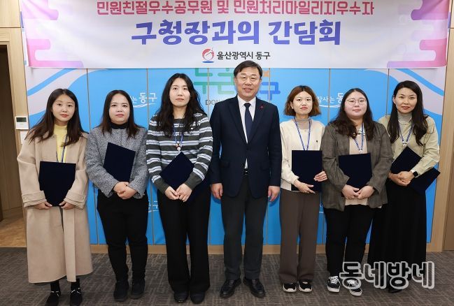 동네방네 김형규 기자 | 울산 동구는 12월 24일 오전 9시 구청장실에서 친절 우수 공무원 등 민원 담당 공무원 6명이 참석한 가운데, ‘하반기 친절 우수 공무원 격려’ 및 ‘구청장과 민원 담당 공무원과의 간담회’를 개최했다.