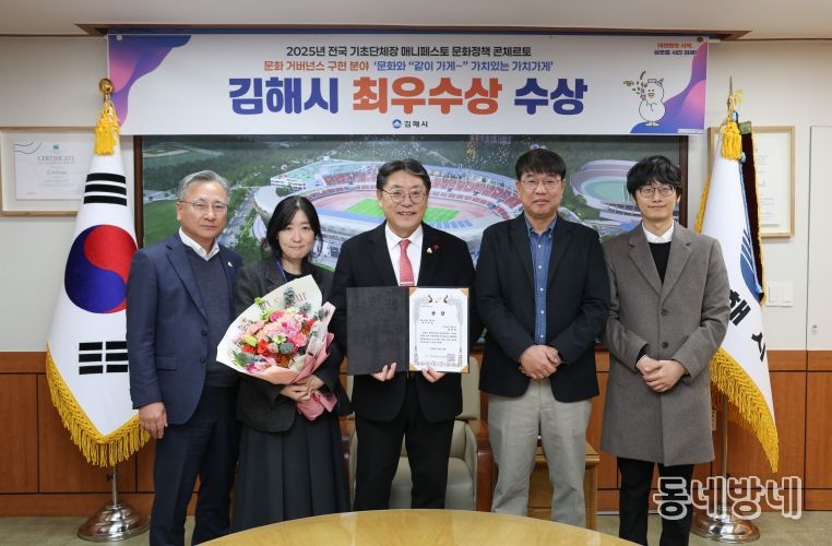 동네방네 김형규 기자 | 김해시는 지난 23일'2025년 전국 기초단체장 매니페스토 문화정책 콘체르토 대회'에서 문화거버넌스 구현 분야‘최우수상’을 수상했다고 밝혔다.