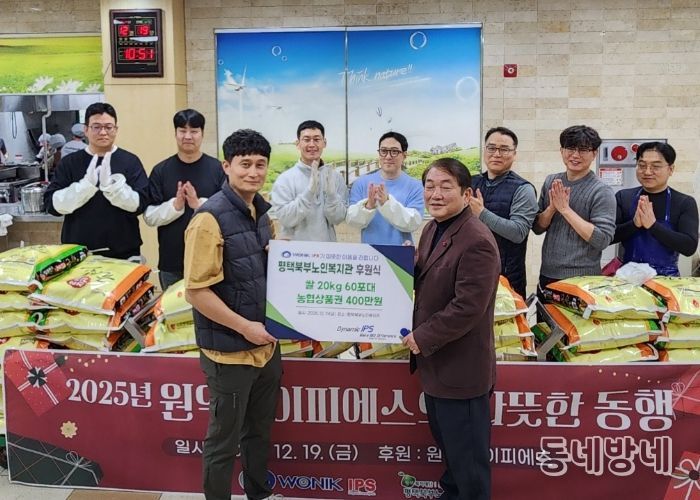 동네방네 김형규 기자 | 원익IPS는 12월 19일, 평택북부노인복지관에 쌀 20kg 60포와 온누리 상품권 4,000,000원을 기부하며 따뜻한 나눔을 실천했다. 이번 전달식은 지역사회 나눔 문화 확산에 앞장서 온 원익IPS의 꾸준한 사회공헌 활동의 일환으로, 지역 내 어르신들에게 실질적인 도움을 주기 위한 의미있는 기부로 진행됐다.