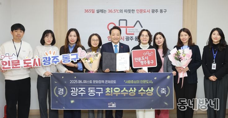 동네방네 김형규 기자 | 광주 동구는 2025 매니페스토 문화정책 콘체르토에서 ‘문화활동 활성화 분야’ 최우수상을 최근 수상했다고 밝혔다. 수상 사례는 ‘365일 36.5℃ 인문도시 광주 동구’ 정책이다.