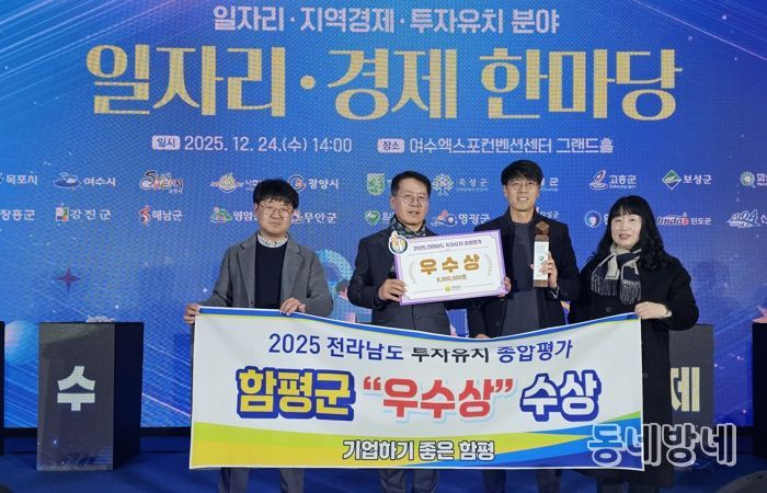 군 관계자는 “이번 수상은 열악한 투자 여건 속에서도 기업 유치를 위해 힘써 온 공직자들의 노력과, 함평을 믿고 투자해 준 기업들의 협력이 함께 이뤄낸 성과”라며 “앞으로도 ‘기업하기 좋은 함평’을 목표로, 지역 산업 경쟁력 강화와 양질의 일자리 창출을 위한 투자유치 활동을 지속해 나가겠다”고 말했다.