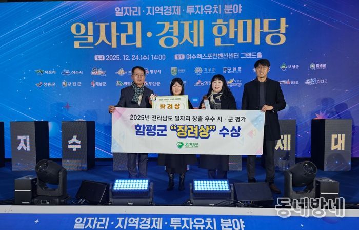함평군은 지난 24일 여수 엑스포컨벤션센터 그랜드홀에서 열린 ‘전라남도 일자리·경제 한마당 행사’에서 2025년 일자리 창출 우수 시군 평가 결과 ‘장려상’을 수상했다고 25일 밝혔다. 이는, 2018년 수상 이후 7년 만의 쾌거이다.
