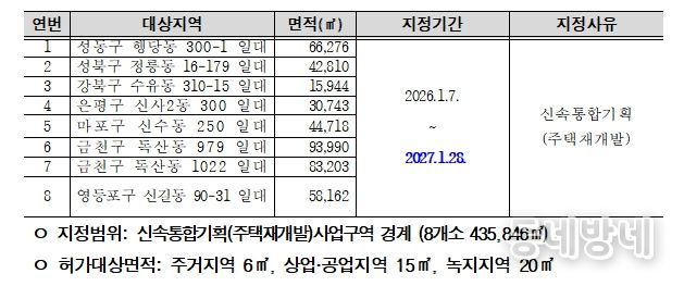 신규 지정 대상은 성동구 1곳, 성북구 1곳, 강북구 1곳, 은평구 1곳, 마포구 1곳, 금천구 2곳, 영등포구 1곳으로 총 8개 구역이다. 성동구 행당동 300-1 일대 외 7곳(총435,846㎡)이며, 효율적인 구역 관리를 위해 기존 신속통합기획 주택재개발 선정 구역과 동일한 만료 기간으로 설정했다.