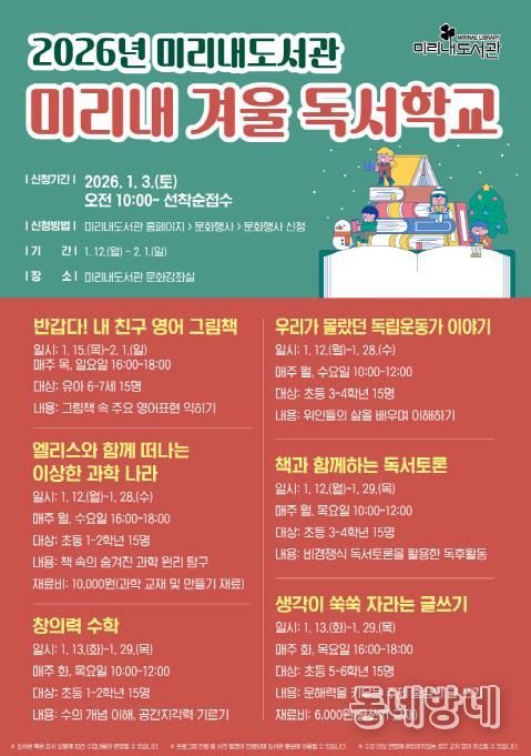 동네방네 김형규 기자 | 원주시 미리내도서관은 오는 1월 유아와 어린이를 대상으로 ‘미리내 겨울 독서학교’를 운영한다.