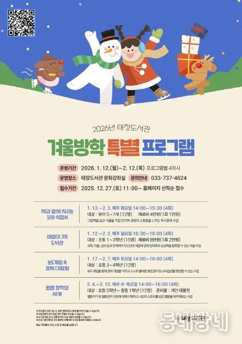 동네방네 김형규 기자 | 원주시 태장도서관은 겨울방학을 맞아 1월 12일부터 2월 12일까지 겨울방학 특별 프로그램을 운영한다.